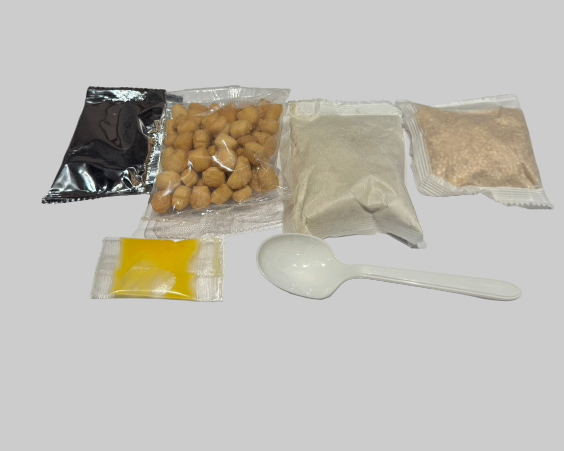 原材料:バター、揚げ菓子(小麦粉/砂糖/食用油などを含む可能性)、干し肉(牛肉)、炊飯米、牛乳入り茶葉